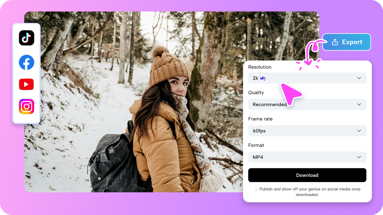 Pippit exports your slideshow in whatever quality your project demands. You can choose video resolution starting from 360p for fast uploads, all the way to 2K for detailed playback. It also lets you set the frame rates from 24fps for a film-like look to 60fps for super smooth motion. With the three export speed options on our best free video slideshow maker, you can prioritize quality or save time depending on your deadline.