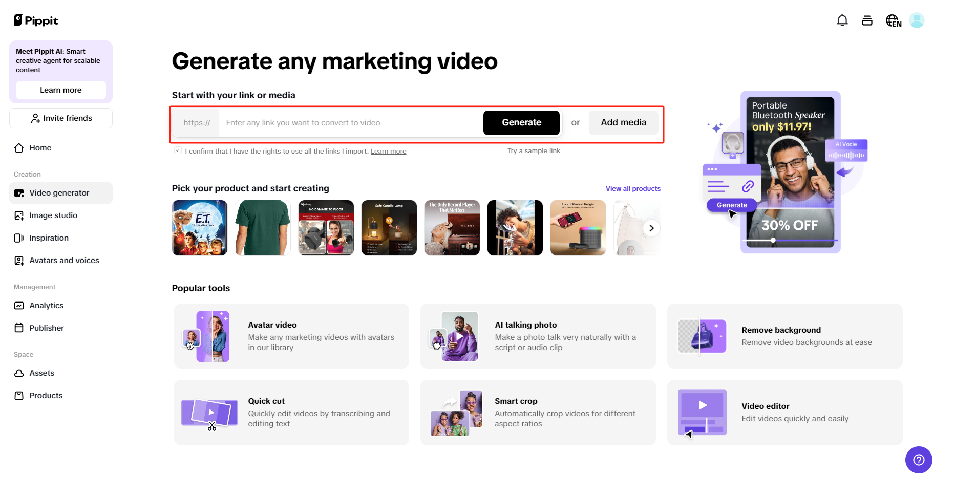Indítsa el a Pippitet, és válassza ki a Videókészítő opciót a bal oldali panelen. A főfelületen illessze be terméklinkjét, majd nyomja meg a „Generálás,„ vagy kattintson a „Média hozzáadása„ gombra, hogy feltölthessen videókat és képeket a marketingvideójához. Ez a rugalmas megközelítés lehetővé teszi, hogy személyre szabott tartalmat hozzon létre közösségi média platformjaihoz vagy promóciós kampányaihoz.