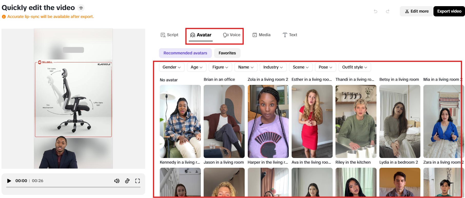A Gyorsszerkesztés ablakban módosíthatja az alapvető elemeket, hogy azok megfeleljenek a márkaarculatának. Finomhangolja az üzenetet a szkript módosításával, válasszon az AI által generált avatárok közül, állítsa be a hangbeállításokat a lebilincselőbb narráció érdekében, valamint igény szerint adjon hozzá vagy távolítson el médiatartalmat. Személyre szabhatja továbbá a szövegstílusokat, színeket és felirat-elhelyezéseket, hogy biztosítsa a következetes és professzionális esztétikát az összes marketingtartalom esetében.