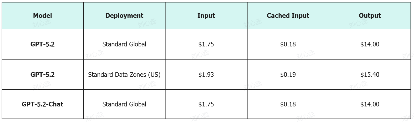 ChatGPT-5.2 is available across multiple deployment options with flexible pricing based on usage and region. The following table breaks down the cost structure to help users understand input, cached input, and output pricing.