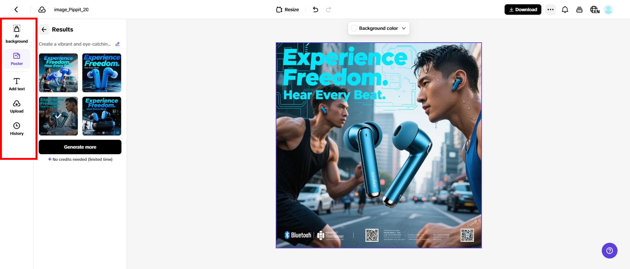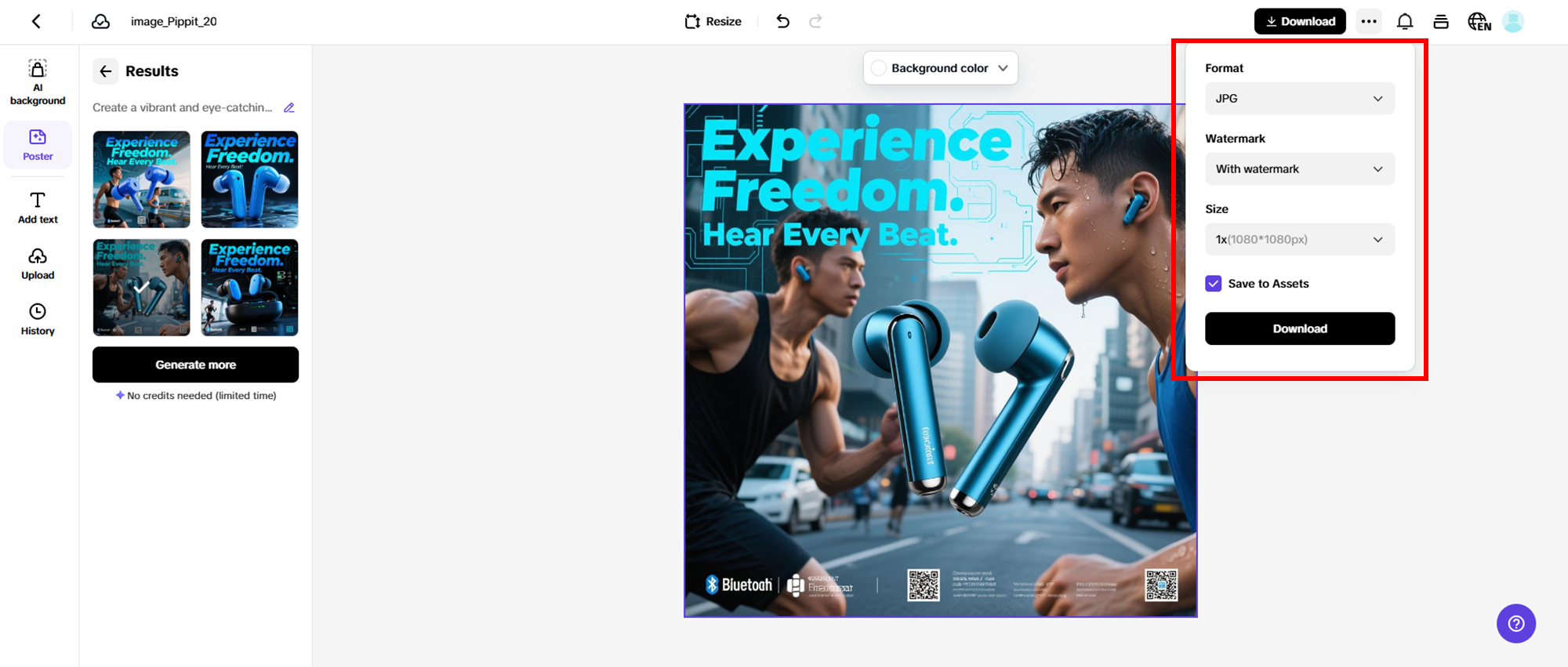 Select the best poster from the options Pippit generates, or refine your prompts to get variations suited for your AliExpress dropshipping campaigns. The "AI Background" tool lets you effortlessly change and improve your poster's background. Use the "Text" feature to insert eye-catching marketing messages with stylish fonts that boost engagement. For further customization, "Edit More" offers stickers, filters, and special effects to polish your product posters with ease.