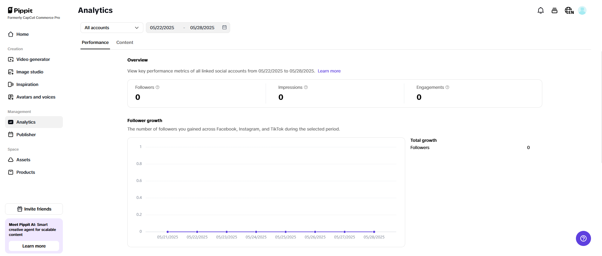Pippit's free best social media analytics help you track how your AliExpress dropshipping videos and marketing visuals perform across social platforms. Monitor key metrics like views, engagement, and click-through rates to fine-tune your campaigns for better sales. The built-in publisher lets you instantly share your content on TikTok, Instagram, and Facebook, simplifying promotion and driving targeted traffic to your dropshipping store.