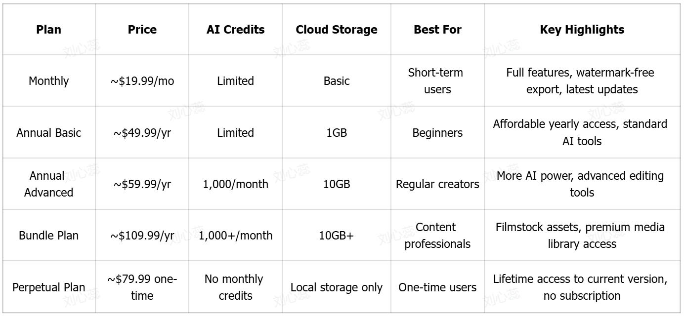 Understanding the pricing structure of Filmora AI video generator helps users decide whether it fits their budget and editing needs. The tool follows a subscription-based model with multiple plans for individuals, along with a one-time purchase option. Pricing also varies based on AI credits, updates, and asset access included in each plan.
