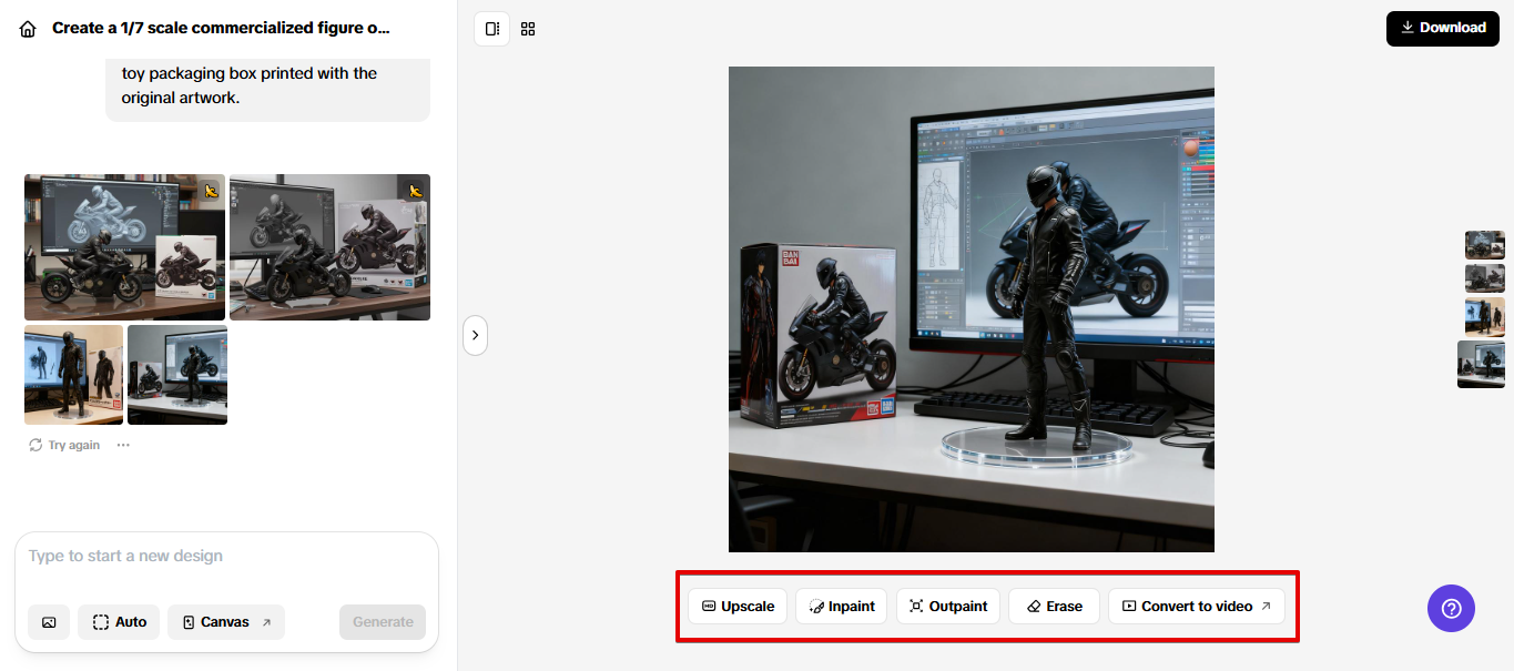 If you need to further customize the photo, use "Inpaint" to add or change elements, "Outpaint" to expand the background, "Eraser" to erase objects, and "Upscale" to increase the resolution. You can also click "Convert to video" to animate the image. Go to "Download" to pick the format and set watermark preferences, and click the button again to export the image to your device.
