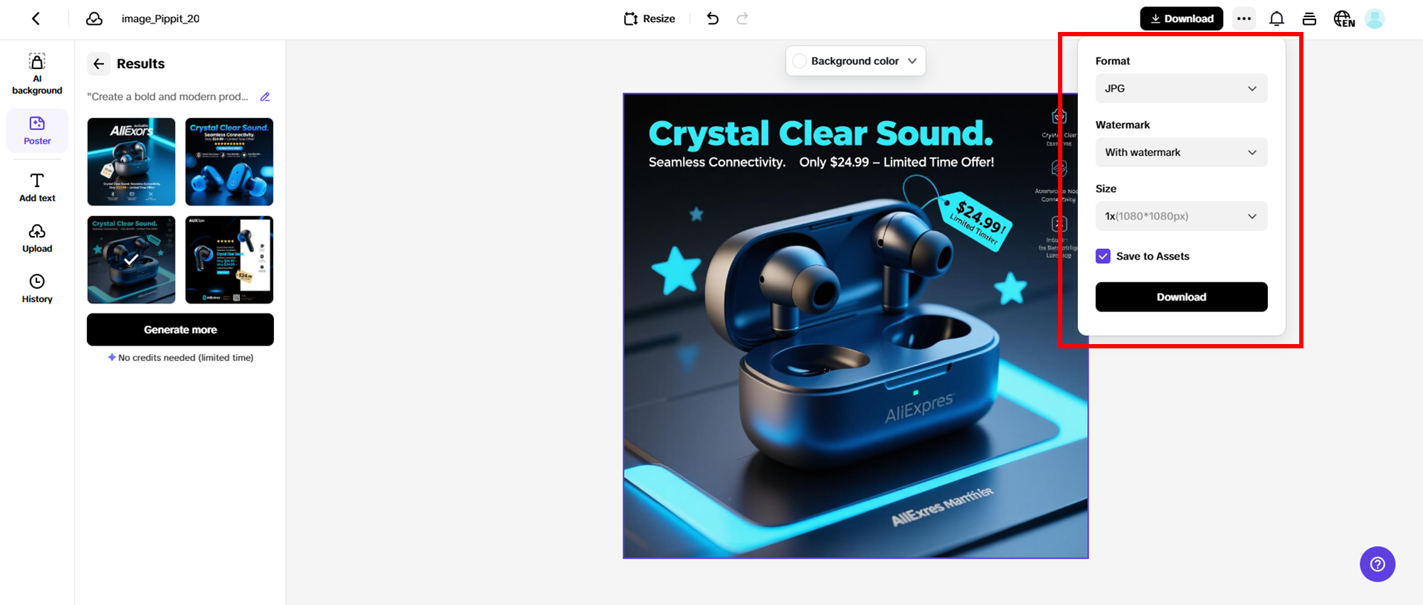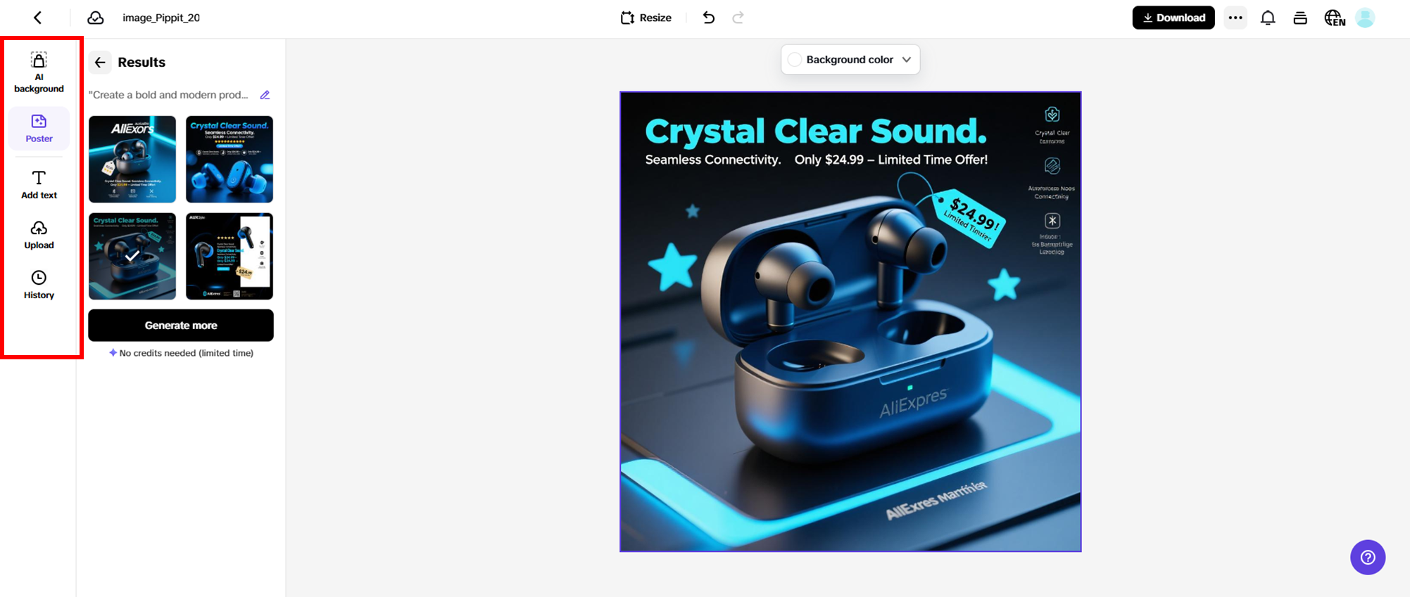 Choose your favorite poster from the generated options, or tweak the prompts to create more variations tailored to your AliExpress product marketing. Use the "AI Background" feature to automatically change and enhance your poster’s backdrop. Click "Text" to add catchy marketing messages with unique fonts and styles that grab attention. For deeper customization, select "Edit More" to apply stickers, filters, and special effects. These advanced tools make designing professional AliExpress product posters quick and effortless.