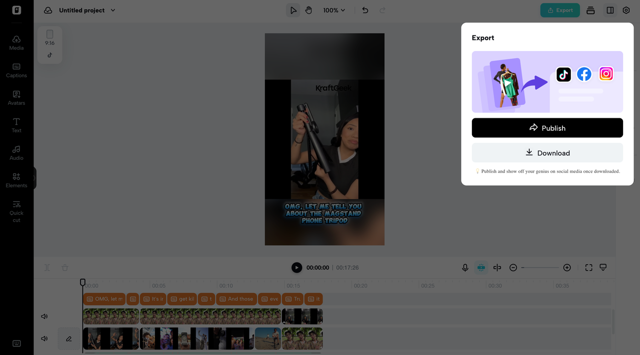 Preview your AliExpress product video to make sure every detail is just right. If needed, make any last-minute edits for a polished look. When you're satisfied, click "Export" and choose to either "Publish" directly to TikTok, Instagram, or Facebook, or "Download" the video to your device. Customize export settings like quality, resolution, frame rate, and format before the final export. Now your video is ready to captivate your audience and drive maximum engagement.