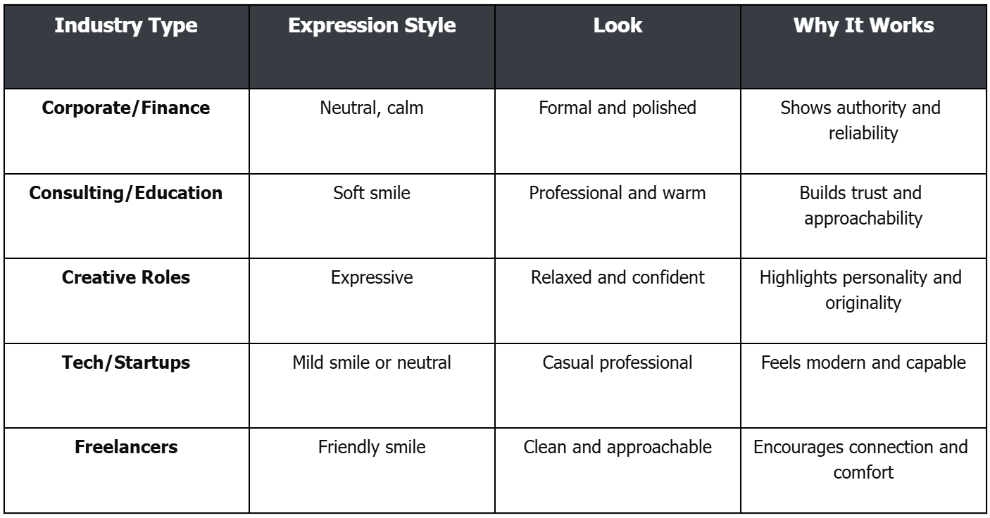Ang isang propesyonal na headshot ay dapat naaangkop sa iyong trabaho at pang-araw-araw na istilo ng trabaho. Inaasahan ng iba’t ibang industriya ang iba’t ibang hitsura at ekspresyon. Kaya, ang malinaw na LinkedIn professional na larawan ay nagtatatag ng tiwala kapag ang estilo ay akma sa iyong papel.